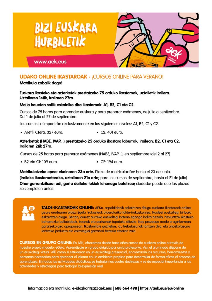• Euskara ikasteko eta azterketak prestatzeko 75 orduko ikastaroak, uztailetik irailera. Uztailaren 1etik, irailaren 27ra.