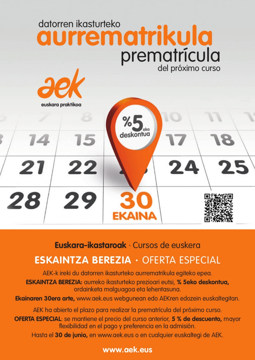 Datorren ikasturtean, 2022/23 ikasturtean, euskara ikasten jarraitu edo euskara ikasten hasi nahi dutenentzat, AEKren matrikulazio eskaintza berezia (AEKren ikasleek zein ikasle ez direnek balia dezakete aukera). Ondorengo loturan egin ahal da: aurre-matrikula.