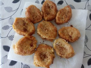 Laukitxotan moztu, irin-arrautzetan pasatu eta frijitu. Amaitzeko, gainetik azukrea eta kanela-hautsa bota nork bere gustura.